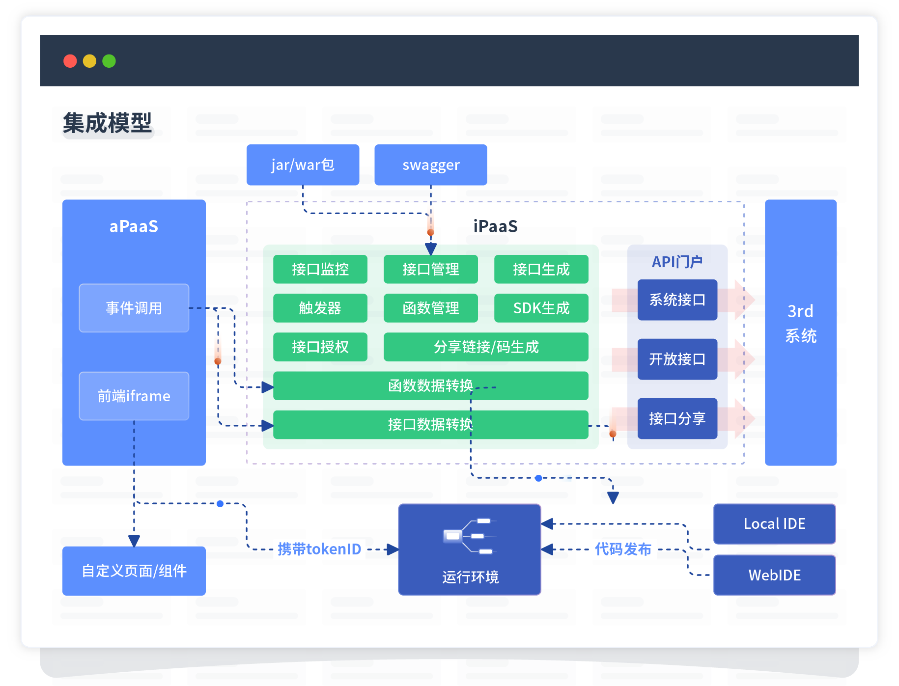 集成模型包括平台本身前、、、、后端能力的扩展,,也支持通过API门户和第三方系统进行交互。。。