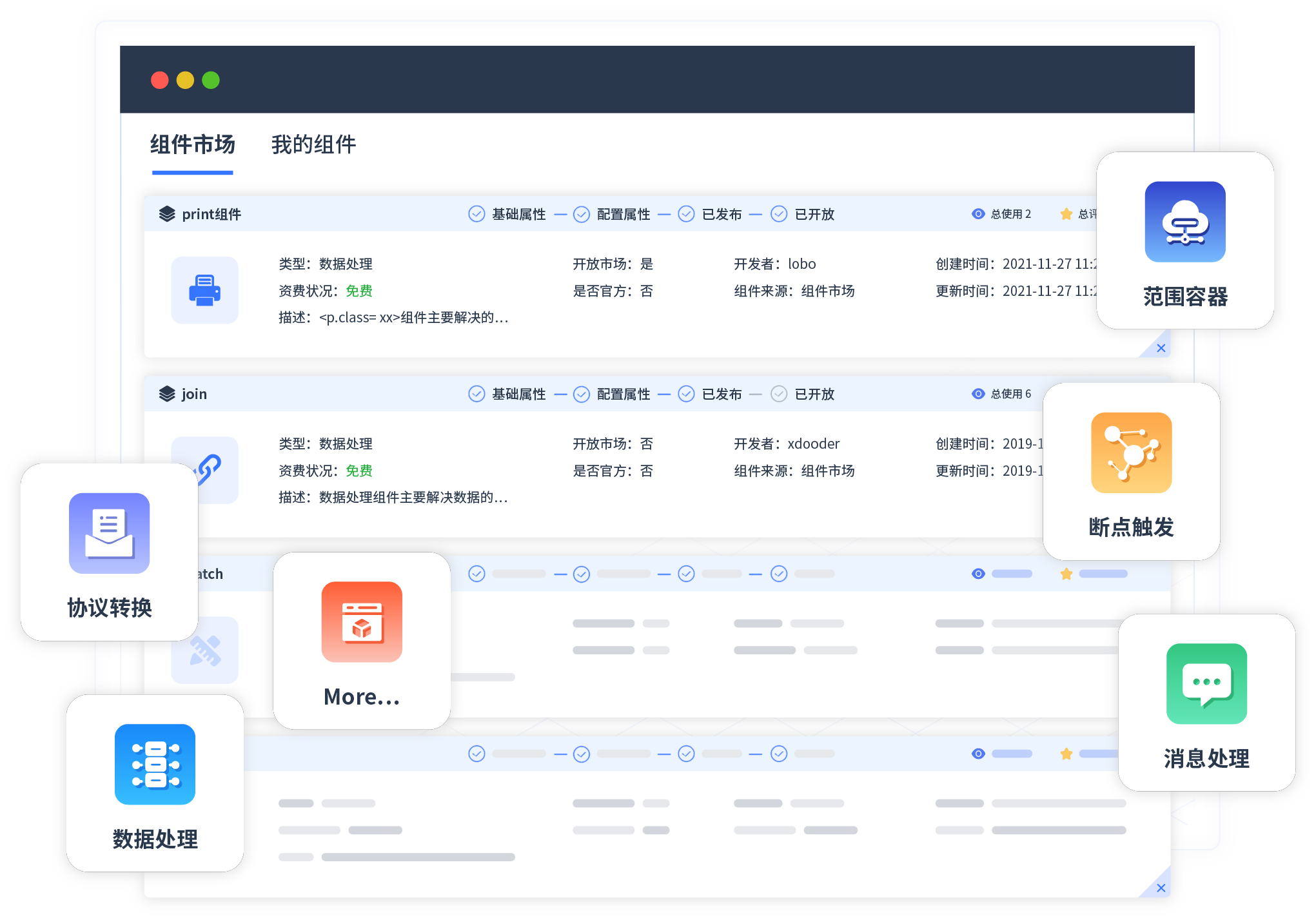 针对集成场景,,,CGPAY钱包提供组件市场,,,例如协议转换、、、、消息处理、、文件操作等。。除平台提供的组件外,,,客户可以自定义所需组件。。