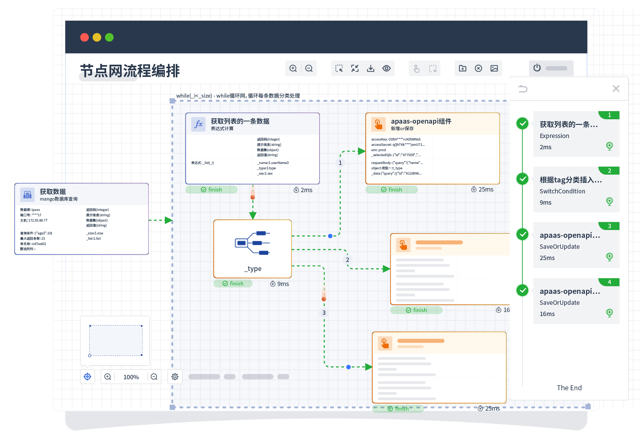 针对集成场景,,,组件定义后支持进行流程编制,,,不同于传统代码方式,,,通过图形化展示,,,支持在线调试、、、、日志查看和运行回放。。。。